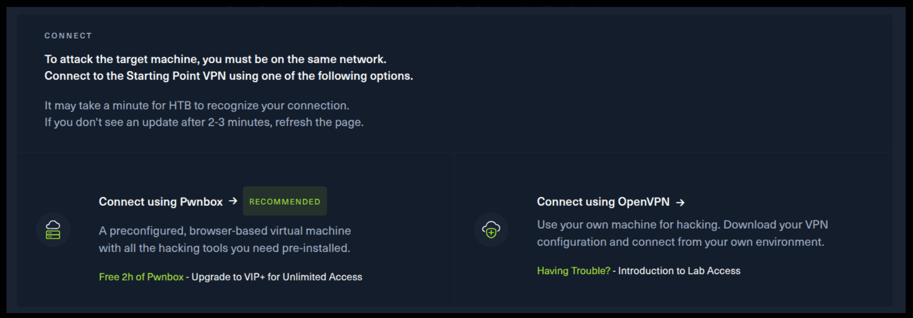 There are 2 options available to connect to our machine. First using Pwnbox or secondly using OpenVPN.